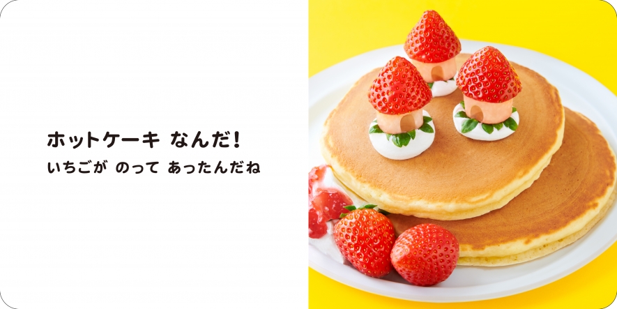 絵本のコンセプトは「食を通じての発見」。近くで見るといちごの家。遠くで見ると、ホットケーキの上にいちごの家がのっていることがわかりました。