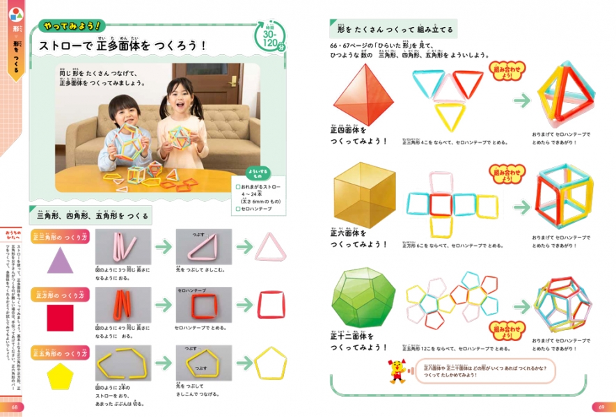 見ているだけでも楽しめて、さらに、手や脚を動かして遊ぶ要素がたくさんあるのがこの図鑑の特徴です。「やってみよう!」のコーナーでは、歩数で長さを測ったり、工作したり、パズルをしたりと、算数に関わるアクティビティを紹介しています。からだを動かすことで、感覚的に算数の考え方を掴むことができます。