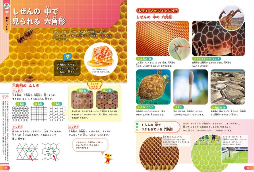 「生きものがつくる丸い形」や「天気が作る形」、「世界の数」など、見ているだけで楽しいコラムも多数掲載。生きものや身の回りのものから興味関心を引き出します。
