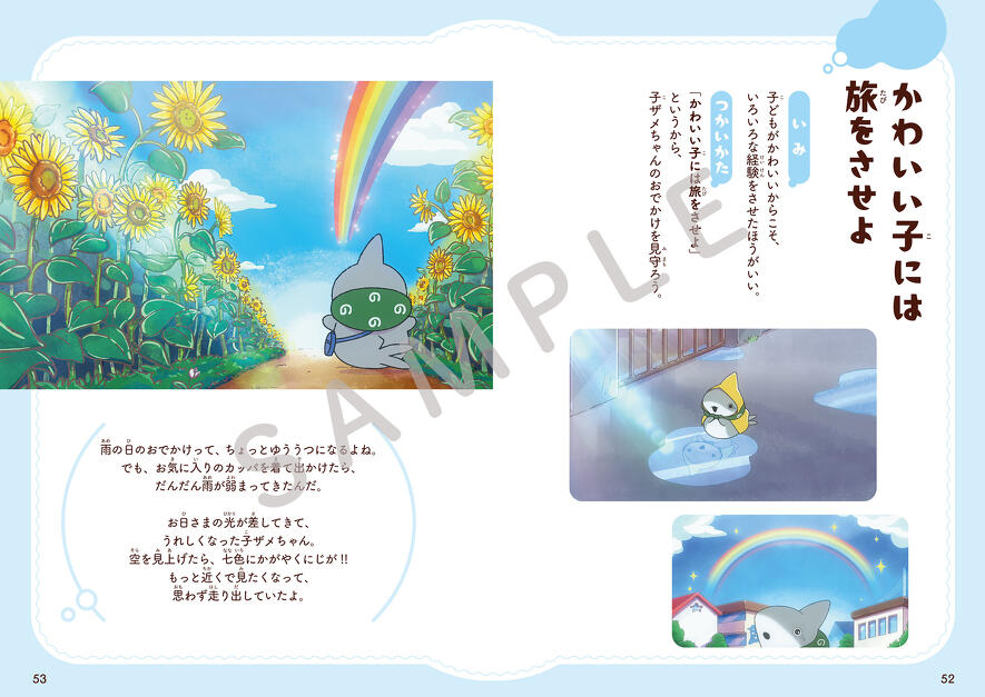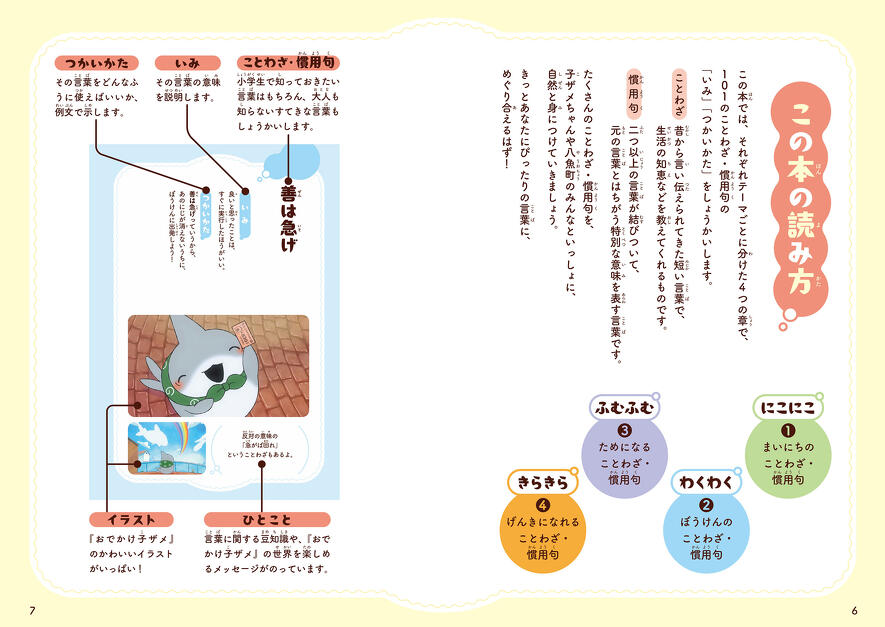 そんな「おでかけ子ザメ」のほっこりあたたかい物語を楽しみながら、たいせつな101のことわざ・慣用句をフルカラーで楽しく学べる本が発売されました。