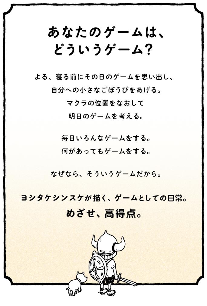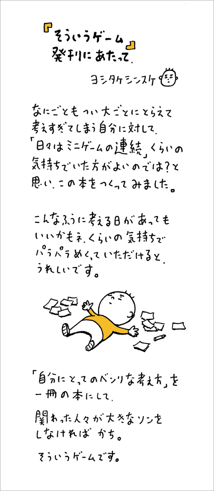 ヨシタケシンスケ『そういうゲーム』 2024年11月20日発売 2024年09月14日 この記事をブックマークする 【書籍情報】 そういうゲーム そういうゲーム 著者: ヨシタケシンスケ 【定価】 1,540円(本体1,400円+税) 【発売日】 2024年11月20日 【サイズ】 その他 【ISBN】 9784041155288 試し読み 紙の本を買う 電子書籍を買う 作家プロフィール ヨシタケシンスケ 絵本作家、イラストレーター 1973年 神奈川県生まれ。筑波大学大学院芸術研究科総合造形コース修了。 日常の一コマを切り取ったスケッチ集や、装画、挿絵など、幅広く活動している。 MOE絵本屋さん大賞、ボローニャ・ラガッツィ賞特別賞、ニューヨーク・タイムズ最優秀絵本賞など、受賞多数。 この記事をブックマークする この記事をシェアする