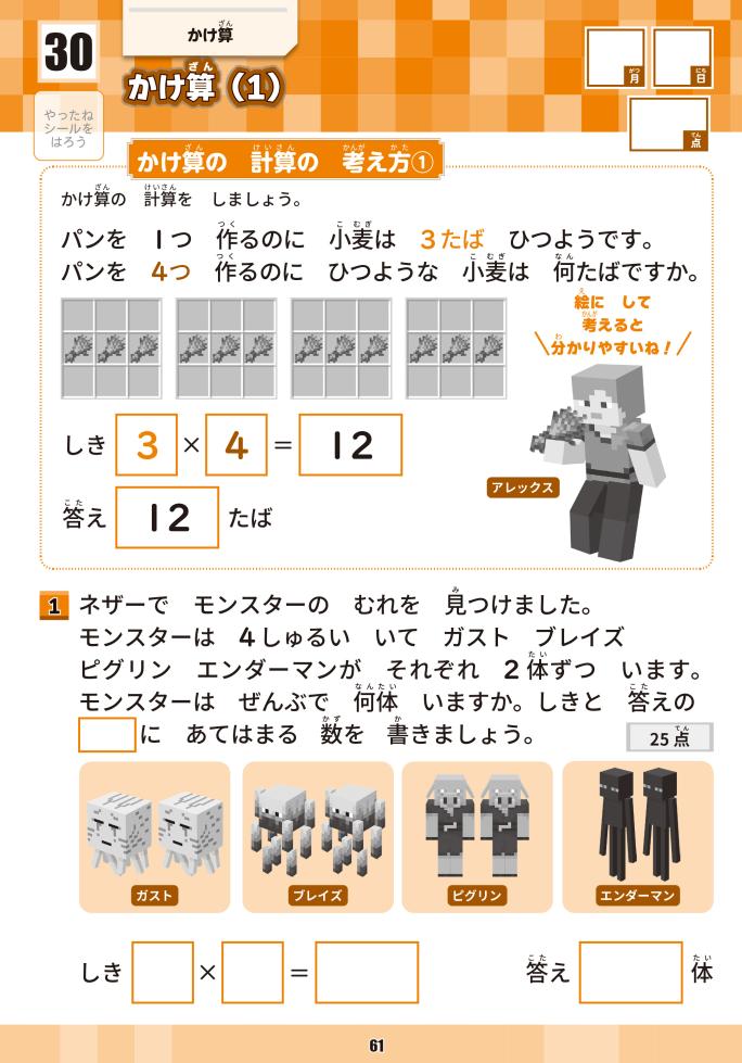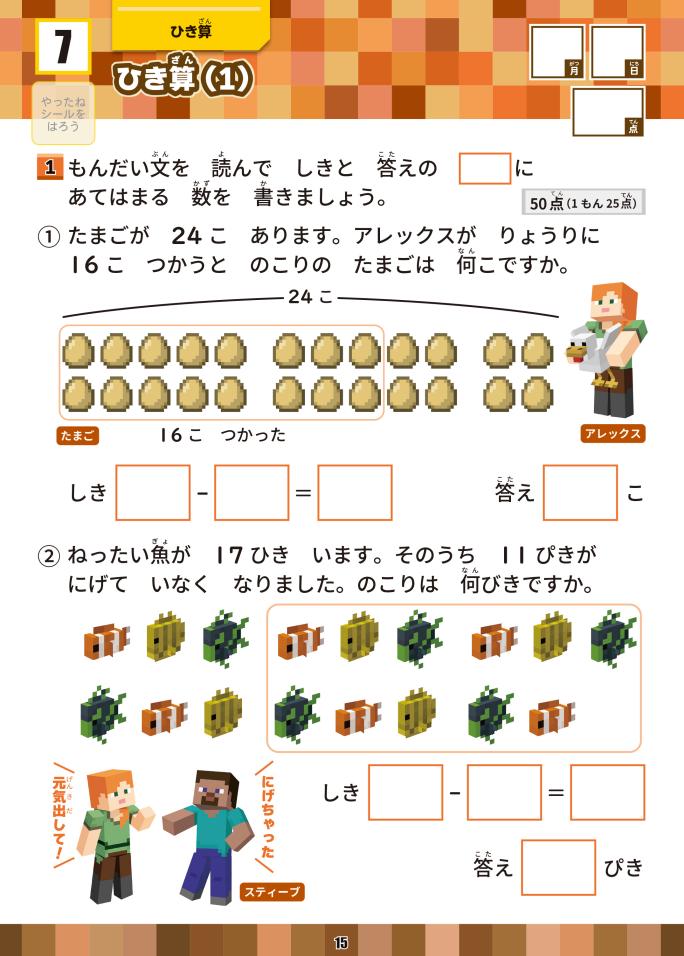 かさや長さの計算、時計の読み方にまつわる文章題など、苦手意識を感じやすい分野もマイクラのキャラクターたちと一緒なら楽しく解き進めることができます。