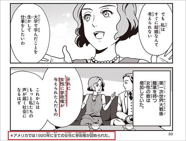 第15巻では、女性参政権が第一次世界大戦後に認められたことを架空のアメリカ人女性に焦点を当てながらまんがのストーリーの中で説明しています。