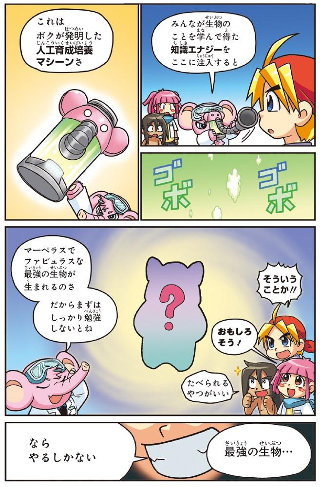 緑豊かな公園や動物園などをめぐりながら、魅力的なキャラクターたちと一緒に、生き物について楽しく学べるストーリー。まんがを読み進めるうちに、植物や動物の体のつくりやはたらき、生き物と地球との深いつながりなど、理科(生物)の学習内容が自然と身につくようになっています。