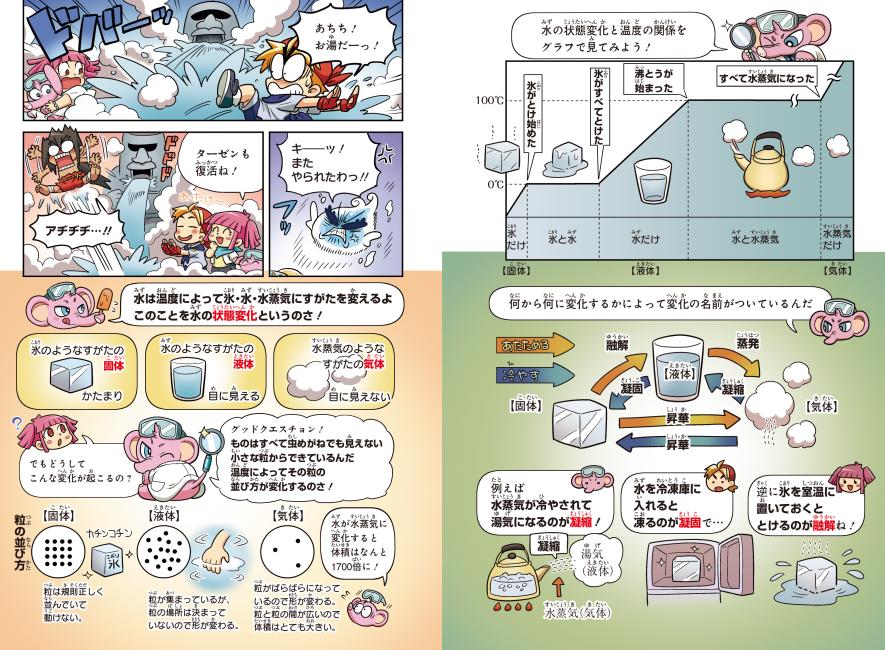 おもしろいストーリーのまんがの中で身近な例を豊富に取り扱うことで、化学について楽しく学べる本に仕上げました。ちょっと難しいと思われがちなテーマでも、イメージしやすい図解を用いてわかりやすく解説。クイズやコラムもあり、楽しんで読み進めるうちに理科(化学)が好きになる一冊です。