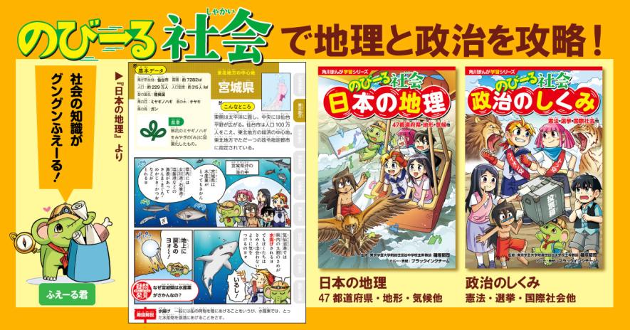 『のびーる社会』は、社会科の学習分野のなかの「地理」と「政治」が学べます。覚えることが多い地理や小学生には少し難しく感じる政治を楽しく学べるように、地域の特色の謎を解き明かす「なぜ?」という疑問や、カードバトル要素をまんがの中にもりこみました。これは楽しく読めるだけではなく、子どもたちがいっしょに考えながら読むしかけとなっているので、社会科の学習で重要な「多角的に考察する力」が自然と育まれます。さらに地図や写真、グラフなどのビジュアル満載の解説ページを読むことで、まんがの内容の理解が一段と深まります。