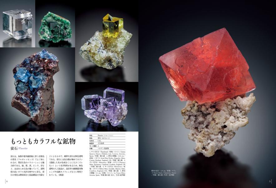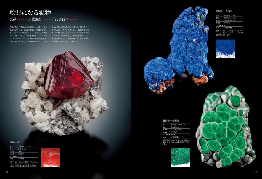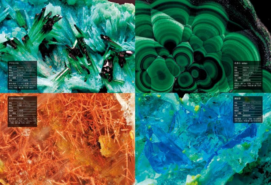 もっともカラフルな鉱物/ルビーとサファイア/宝石になる鉱物/ダイヤモンド/水晶のバラエティ/多彩なシリカ/簾の石たち/銅をふくむ鉱物たち/マンガンの赤/ウランとその資源/絵具になる鉱物/毒の石/電気石/アスベスト/菱な結晶/重い石/リチウムの地下資源/鉄鋼を作る資源鉱物/光る石/鉱物になった古生物たち/鉱物の色のメカニズム/日本で見つかった新鉱物…ほか