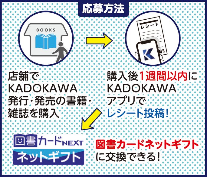 レシート対象期間中に書店(実店舗)でKADOKAWA発行・発売の書籍・雑誌を購入したレシートと本のバーコードを、購入後1週間以内(1週間後の同じ曜日の23:59まで)にKADOKAWAアプリにご投稿ください。