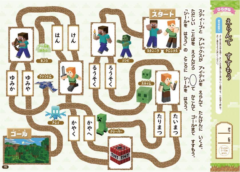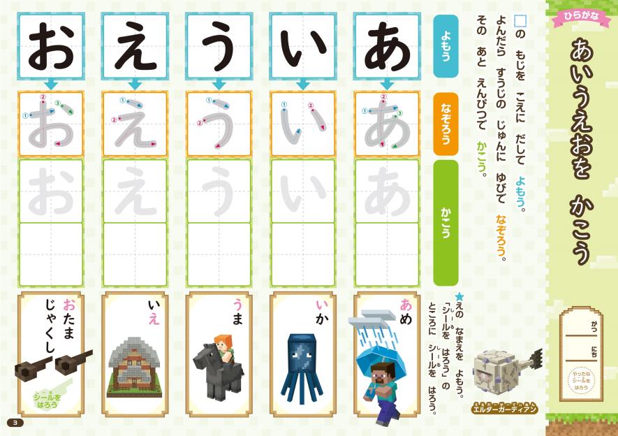 マインクラフトのイラストが満載で、マイクラ好きのお子さまが無理なく自然にひらがなを書き、カタカナが読めるようになるドリルです。ゲームの世界観を楽しみながら文字を練習することができます。また、解いたページに貼れるシールや問題に貼るシール、ミニクイズや迷路のような遊び要素も豊富で、お子さまが飽きることなく取り組める工夫を凝らしています。