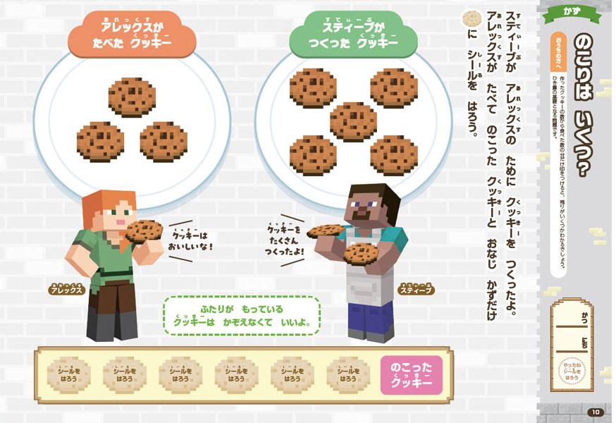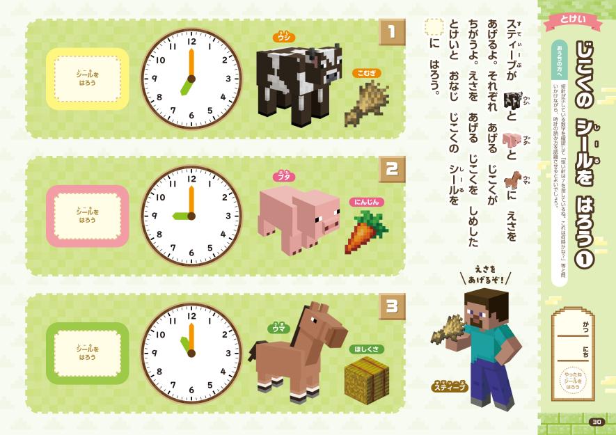こちらもマイクラのイラストが満載で、お子さまはゲームの世界観を楽しみながらドリルに取り組むことができます。1~20までの数の数え方や、お子さまがつまずきがちな時計の読み方も紹介しています。