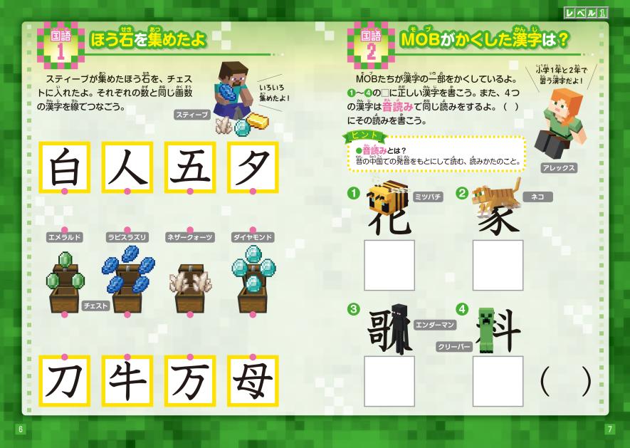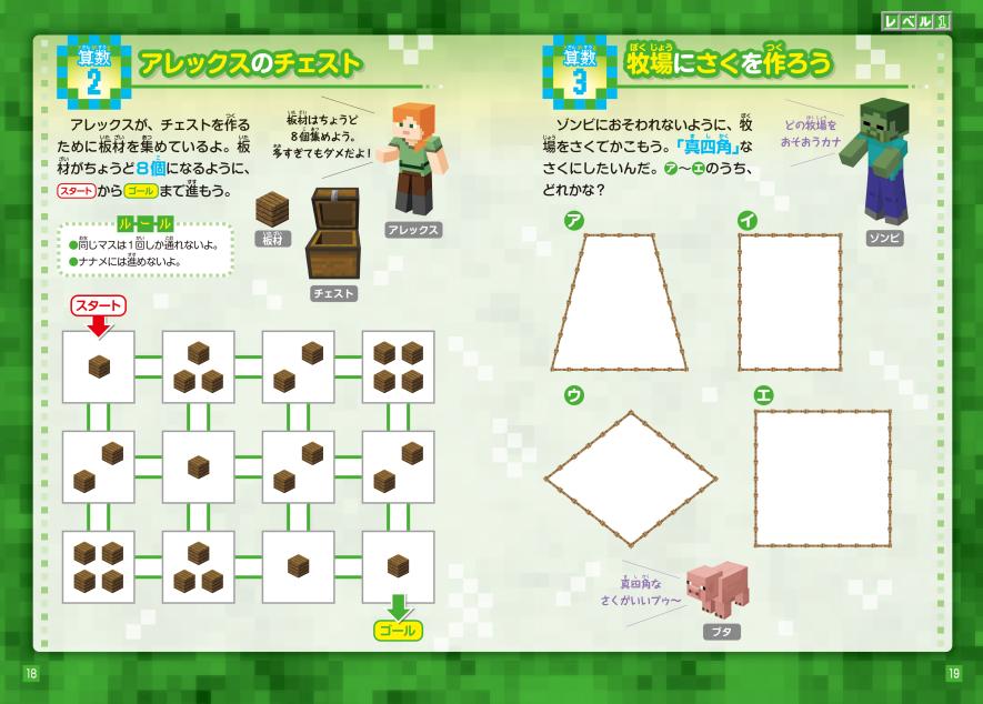 掲載しているパズルはどれも国語と算数の知識や考え方を用いて取り組む問題です。章が進むにつれて難易度も上がっていき、何度も繰り返しチャレンジすることができます。また、スティーブやアレックスはもちろん、おなじみのMOBたちも登場! マイクラ好きのお子さまにオススメの1冊です。