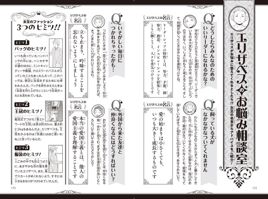 エリザベス女王二世が生きた時代/お宝発見/もしもエリザベスが20世紀にSNSをしていたら/エリザベスのお悩み相談室/エリザベス二世検定クイズ55/年表