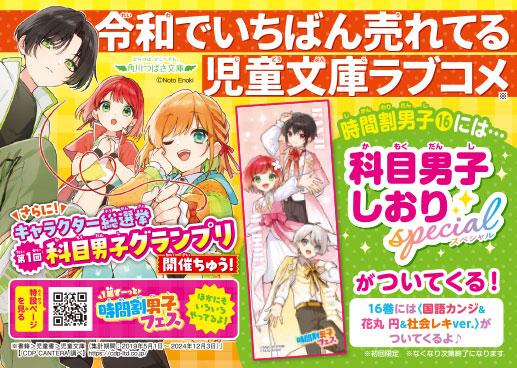 「読むだけで勉強のやる気が出る!」と、小中学生から絶大な支持を集める大人気小説シリーズの最新刊『時間割男子(16)つぎなるライバル、家庭科くん&保体くん!?』が児童文庫シェアNo.1レーベル※2 角川つばさ文庫より3月12日(水)に発売しました。