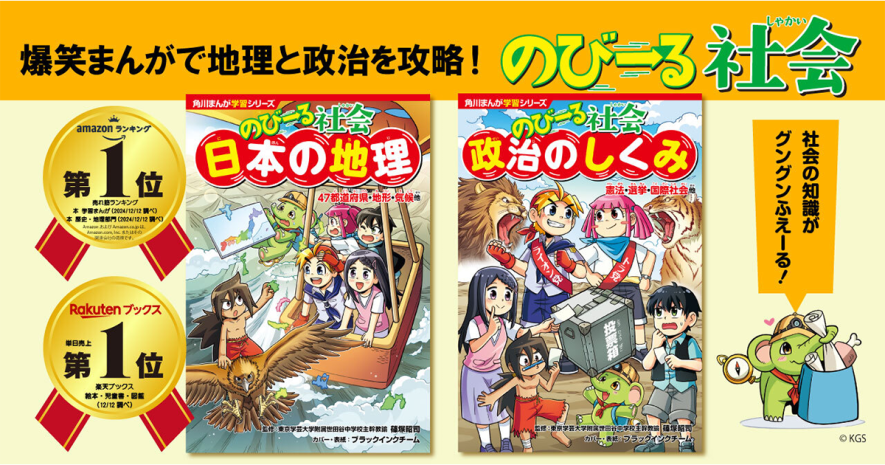角川まんが学習シリーズ『のびーる社会 日本の地理 47都道府県・地形・気候他』『のびーる社会 政治のしくみ 憲法・選挙・国際社会他』(監修:東京学芸大学附属世田谷中学校主幹教諭 篠塚昭司)は、楽しいまんがで地理と政治が学べる学習まんがです。
