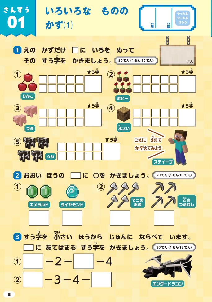 ※画像は『夏休みドリル マインクラフト さんすう・こくご・えいご 小学1年』の内容です。