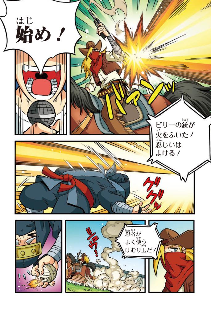 「どっちが強い!?」シリーズは動物バトルだけではありません! ちょっと変わった職業バトル編も新登場!! 特殊な技能をほこる忍者とカウボーイ、どっちが強いかをその職業にまつわる技術や歴史などを通じて学べます。