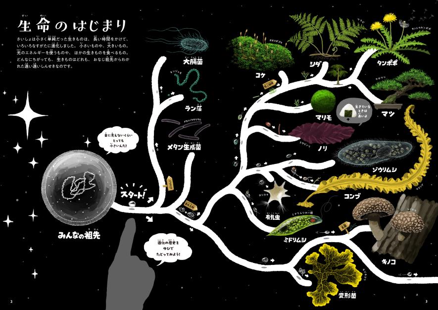 この絵本では、三上智之さん(国立科学博物館 特別研究員PD)の監修のもと、近年研究が進んでいる「分子系統解析」の成果など最新の知見を取り入れることで、生命のはじまりから人類の誕生までを、ひとつながりの系統樹として描くことができました。