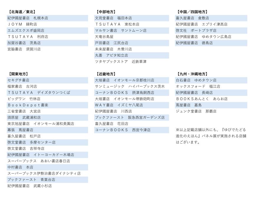 本書の刊行を記念し、全国75店舗の書店で『ゆびでたどる進化のえほん』パネル展を2025年6月11日(水)より随時開催します。