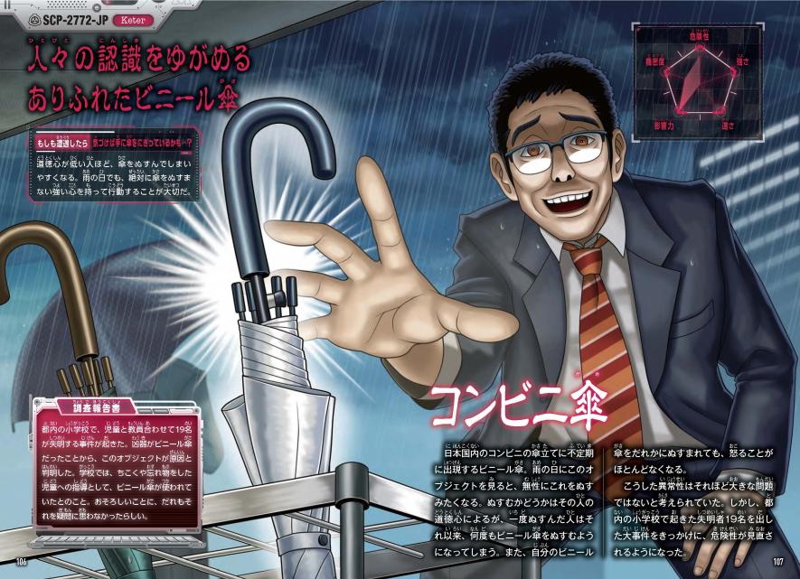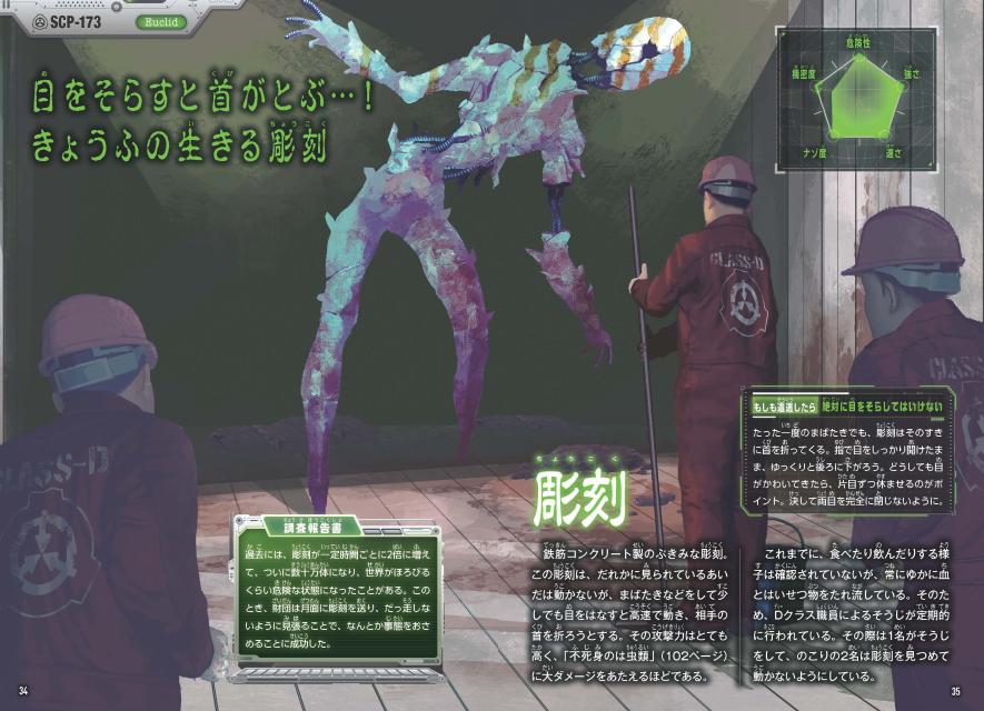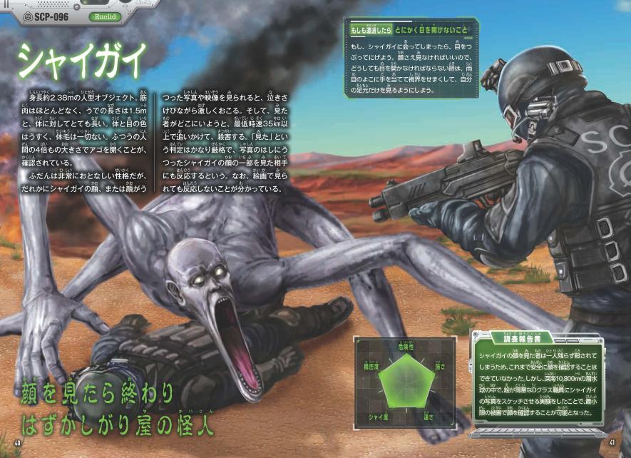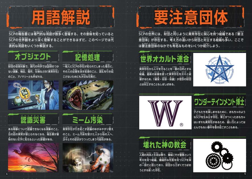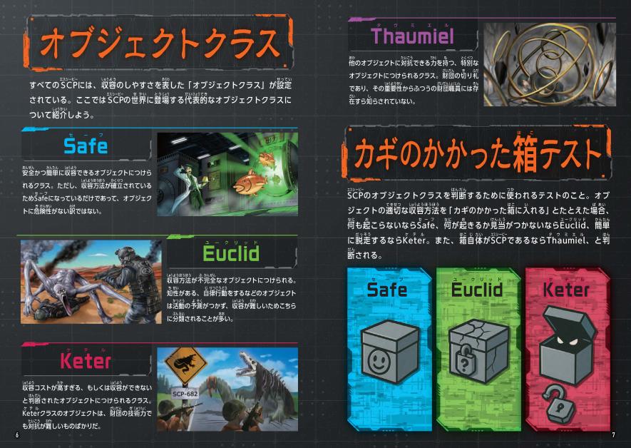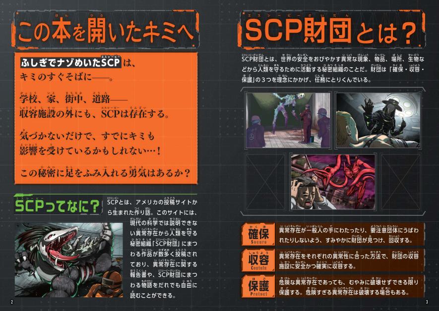 SCPの世界に登場する用語や、オブジェクトの収容難易度などを、解説ページで分かりやすく説明しています。SCPが大好きなお子さまはもちろん、SCPに興味を持ち始めたお子さまにもぴったりな1冊です。