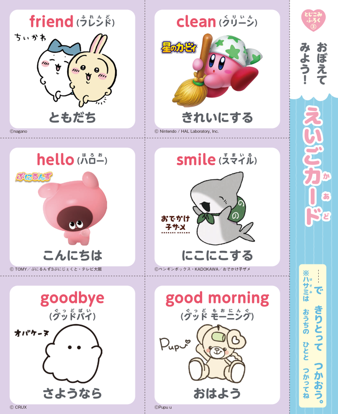 おけいこが終わったページに貼れる「できたよシール」のほか、切り取って使えるひらがなカタカナポスターや、えいごカード、はんたいごカード、おてがみメモなど、おけいこがさらに楽しくなるとじこみふろくにも注目です!