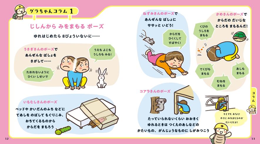 時系列にあわせたストーリー仕立てのため、避難行動の流れがとてもわかりやすく、小さいお子さんにも読み聞かせできます。本編はすべてひらがなのため、未就学児からひとりで読むこともできます。コラムでは命を守るポイントをしっかり解説。つい見落としがちな避難所での生活や注意点などについても、一章を割いて丁寧に描いています。