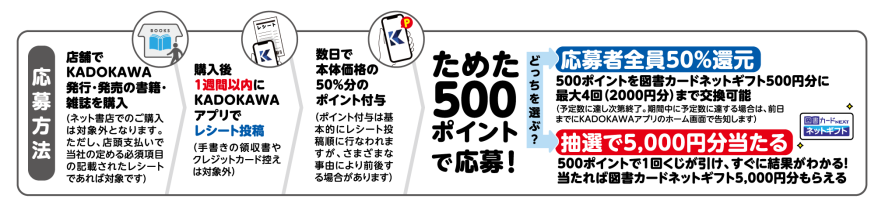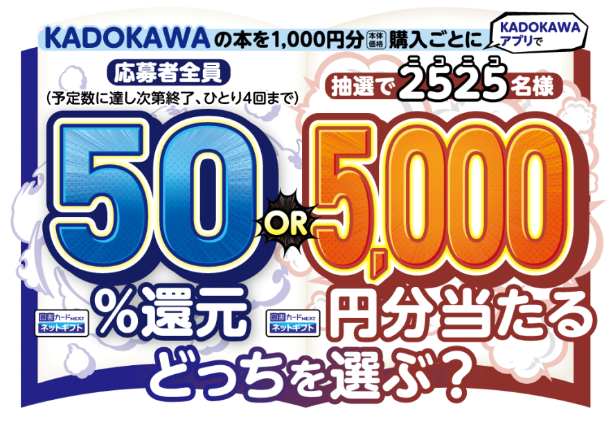 ■「応募者全員50%還元」の図書カードネットギフト500円分は、予定数に達し次第終了します。期間中に予定数に達する場合は、前日までにKADOKAWAアプリのホーム画面で告知します。