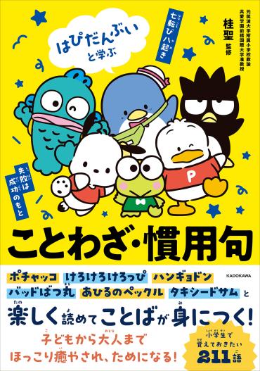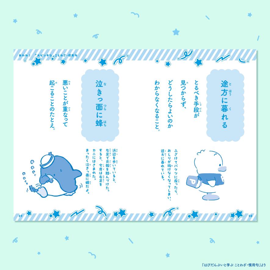 『はぴだんぶいと学ぶ ことわざ・慣用句』では、「応援してくれる」「心が軽くなる」などのポジティブなことわざ・慣用句をはじめ、「ざんねんな」「大ピンチな」ことわざ・慣用句など、ちょっぴりせつなくて、思わずクスっと笑ってしまう言葉も紹介しています。