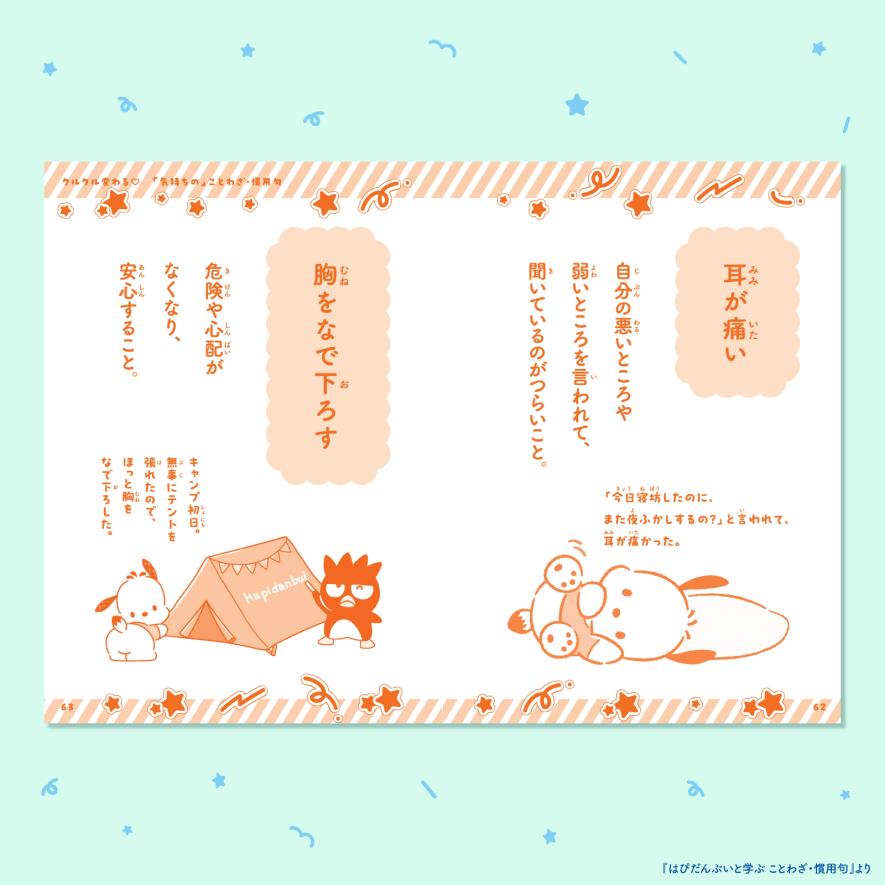 はぴだんぶいのイラストとキャラクターにちなんだ例文で、「ことわざ・慣用句」「四字熟語」をわかりやすく紹介するシリーズです。