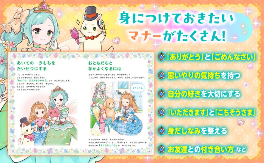 この本では、憧れのプリンセスの物語を何度も夢中で楽しむうちに、社会で生きていくために大切にしたい「おさほう」や「マナー」が自然と身につくよう工夫しました。