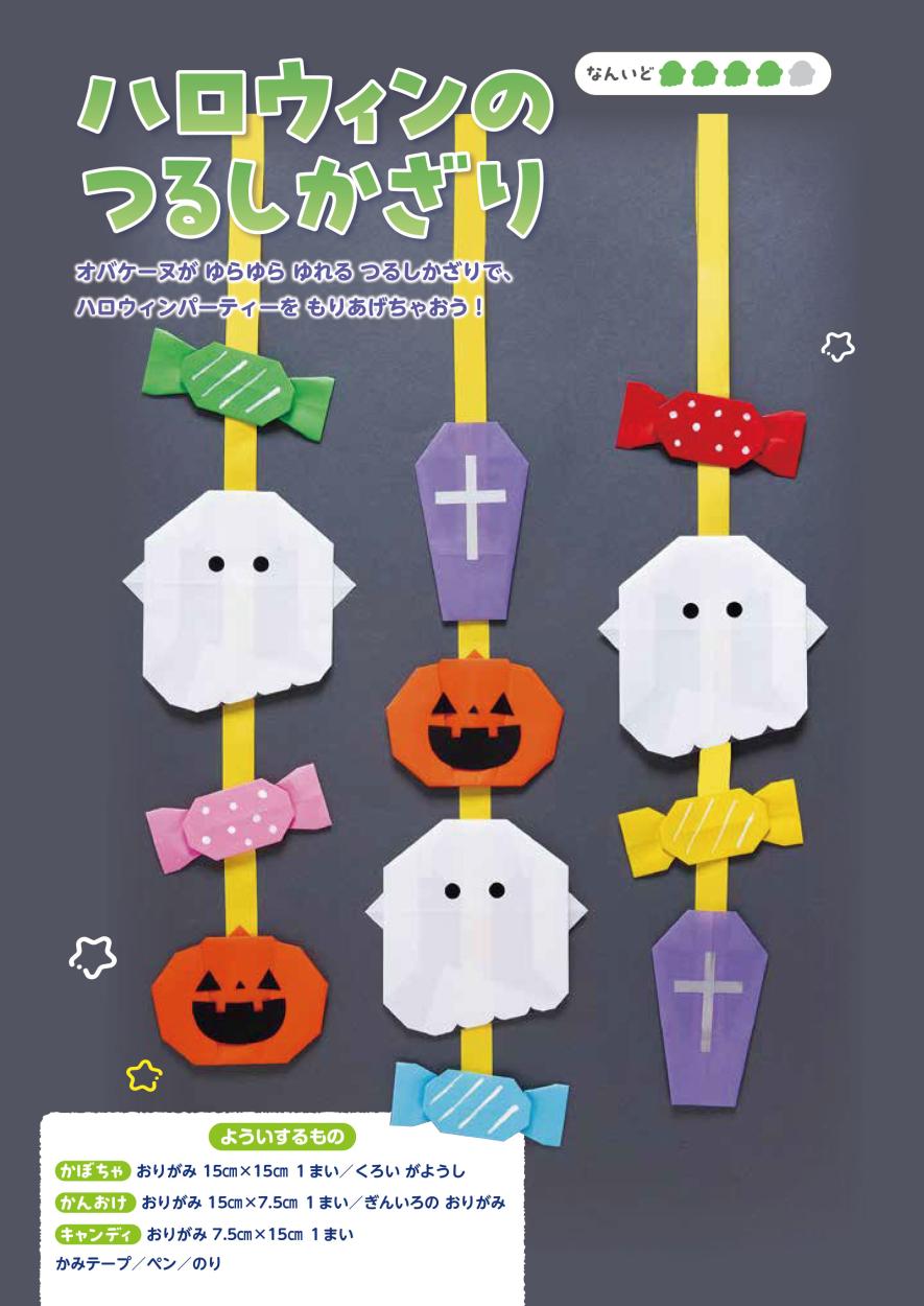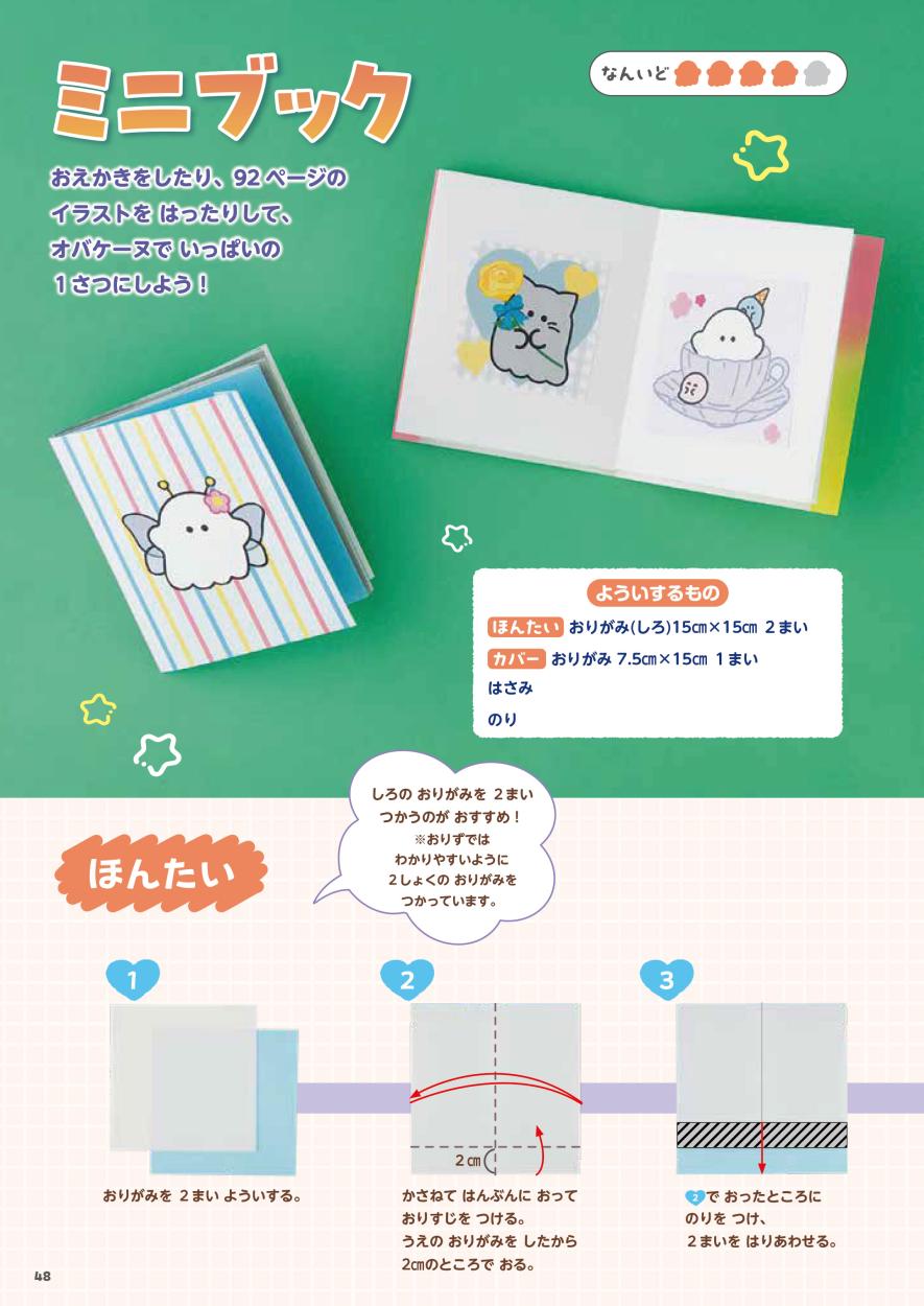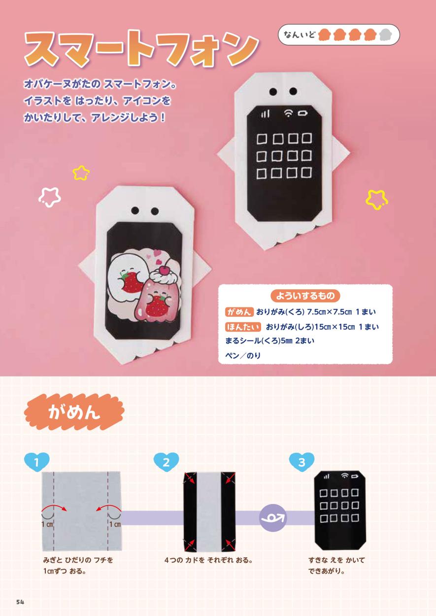 オバケーヌ型の「スマートフォン」や、付属のイラストで飾り付けてもかわいい「ミニブック」など、作った後に実際に遊んだり使ったりできる作品を収録しています。