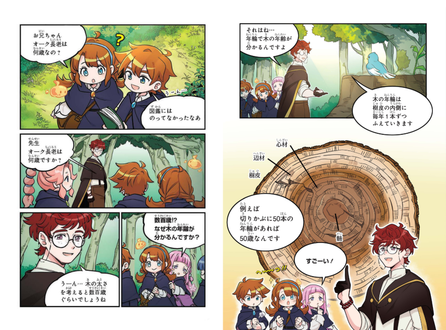 リリーとスカイは「オーク長老」が何歳であるかを疑問に思いますが、それは「スカイが読んだ図鑑にはない知識」でした。そこで、先生と一緒に年輪を観察し、年輪からさまざまなことを学びます。
