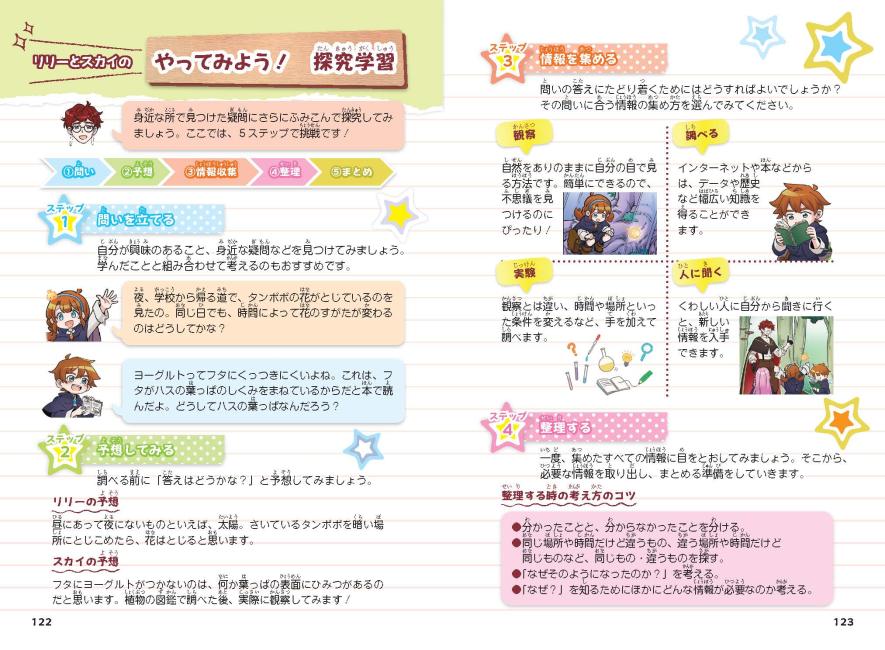 リリーとスカイがそれぞれ違う疑問を持ち、それぞれの方法で学習していく様子から、探究学習の考え方が身につく