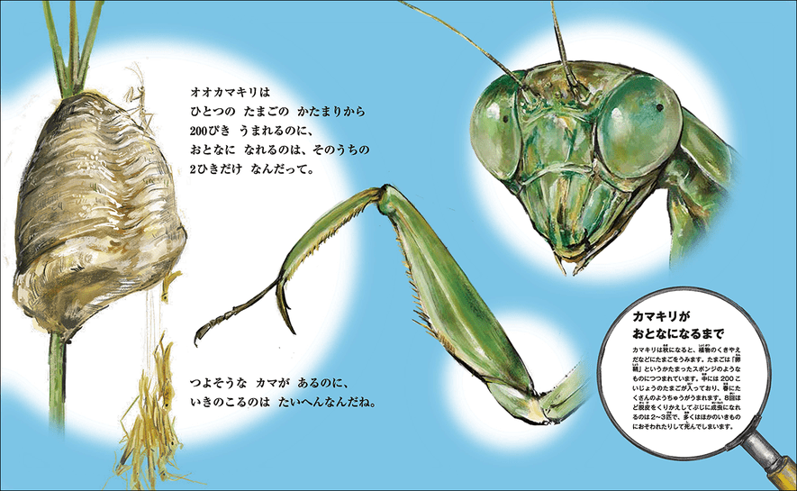 昆虫たちは絵本の中にいるから、「予測不能な動き」はしないし、解説部分に添えられたゆるーいタッチの絵は、子どもたちの興味を引き出します。そしてなによりの魅力は、大迫力で細かなところまで描かれている昆虫たちの力強い姿。