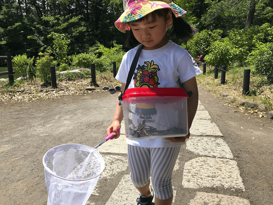 虫とり網と虫かごを持って、近くの公園に繰り出しました。