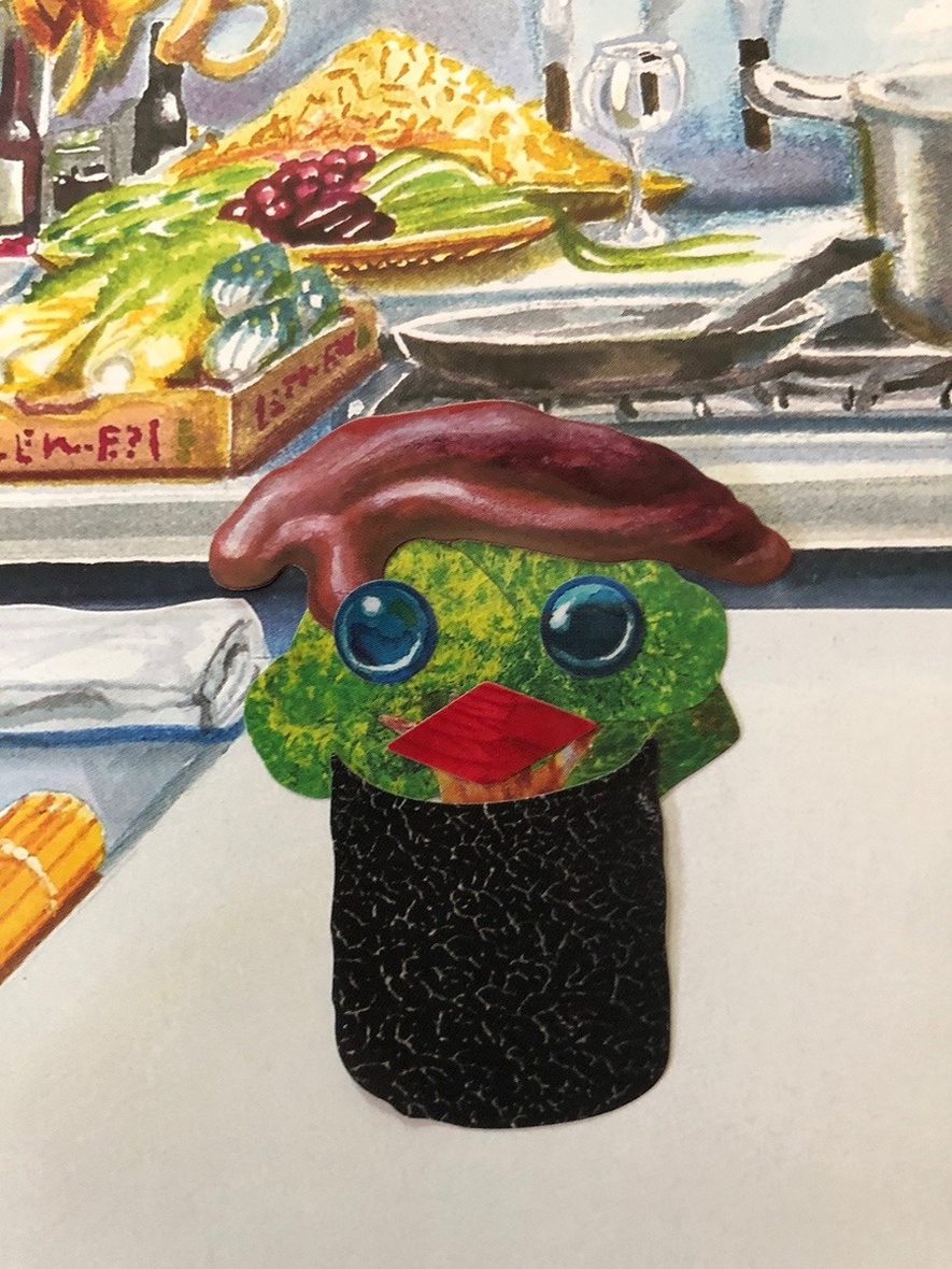 こんもりした緑の木に……上から海苔を貼って、赤い菱形、茶色のどろっとしたものをのせて……、名づけて「ぼうし」寿司!