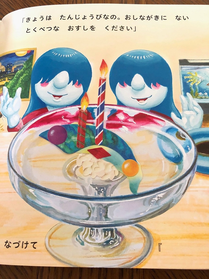 それから次へ次へとページをめくり、「きょうは たんじょうびなの。おしながきに ない とくべつな おすしを ください」という場面にあわせて、小3女子がつくったのが、こちら。名づけて「ふたごぴぷぴぽ」だそうです。涼しげでスイーツみたいなお寿司!