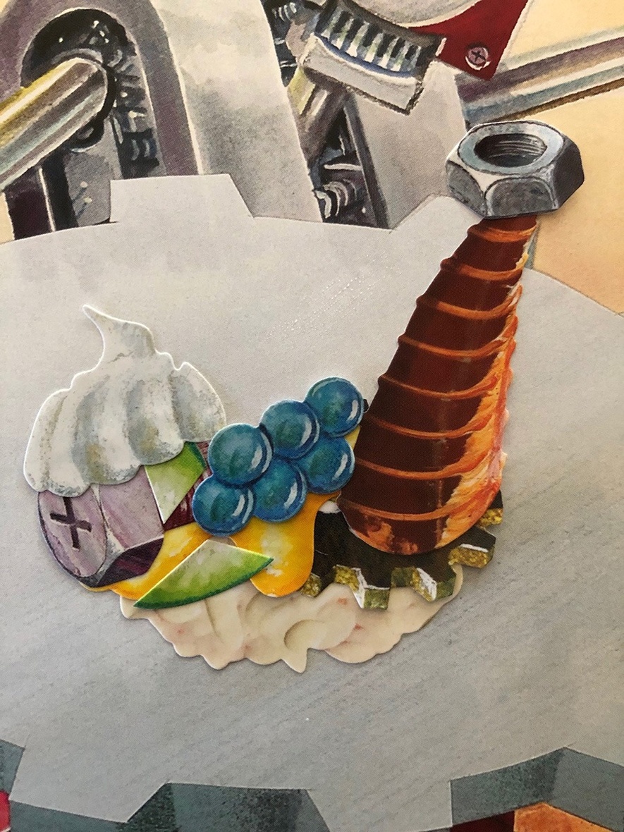 「ワタシ モ オスシ タベタイ デス」というロボットに出したお寿司はこちら、「部品ソフト」。金具の部品が歯ごたえのあるアクセントに……生クリームも乗っておいしそう!