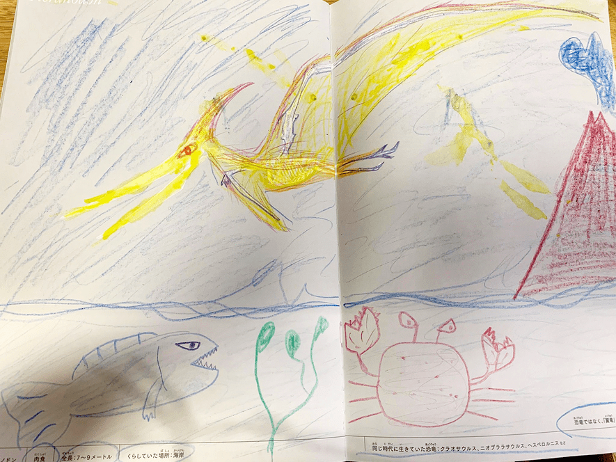 恐竜をはじめとした古生物が大好きな塾生たちと、この本を開いてぬりえに興じていると、子どもたちから次々と「問い」があふれでてきました。