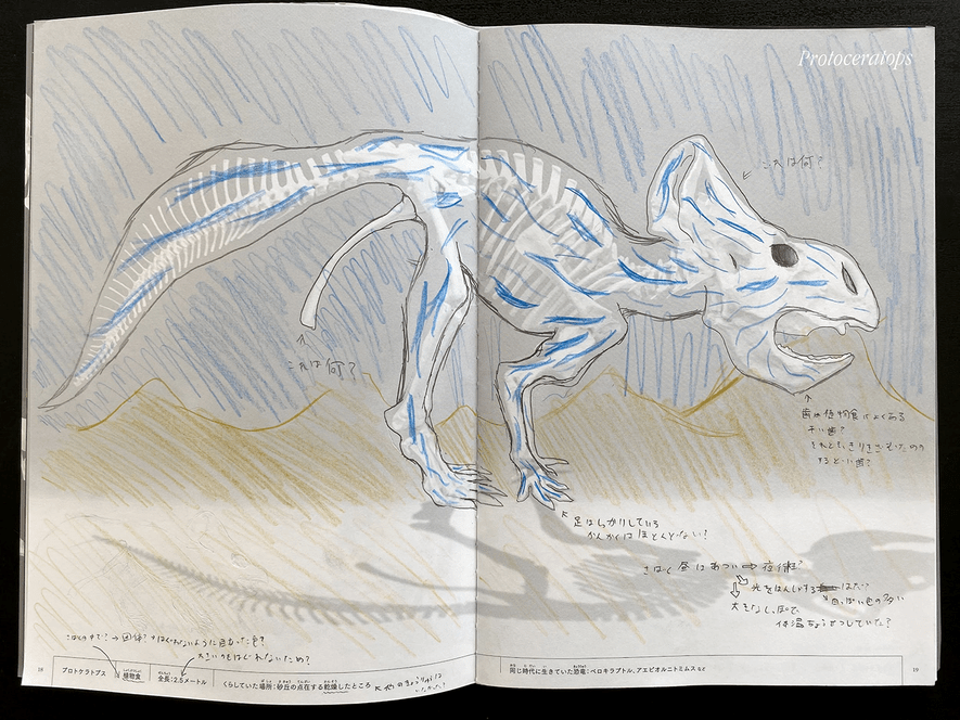 彼女は今の生き物たちの特徴を捉えながら、僕らの世界につながる命のバトンリレーを感じ取っていたようです。恐竜の骨と対峙しながら、さながら古生物学者のように、多くが謎に包まれている恐竜の体表の色を想像し、小さな書き込みを加え、自分なりのプロトケラトプスを描いていました。