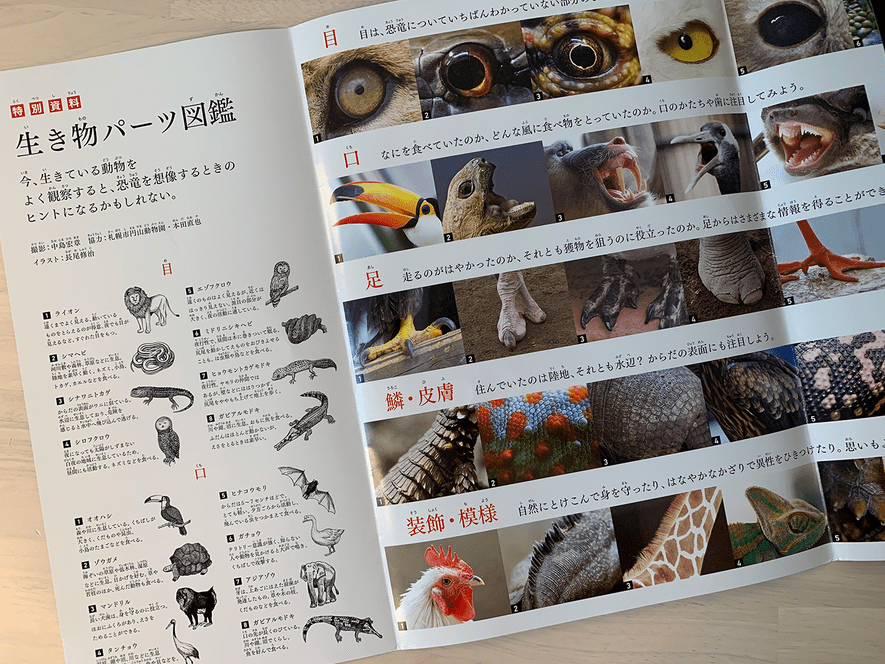特に参考にしていたのが、本のカバー裏にある「生き物パーツ図鑑」。今の生き物の、いろんな部位の写真が載っています。