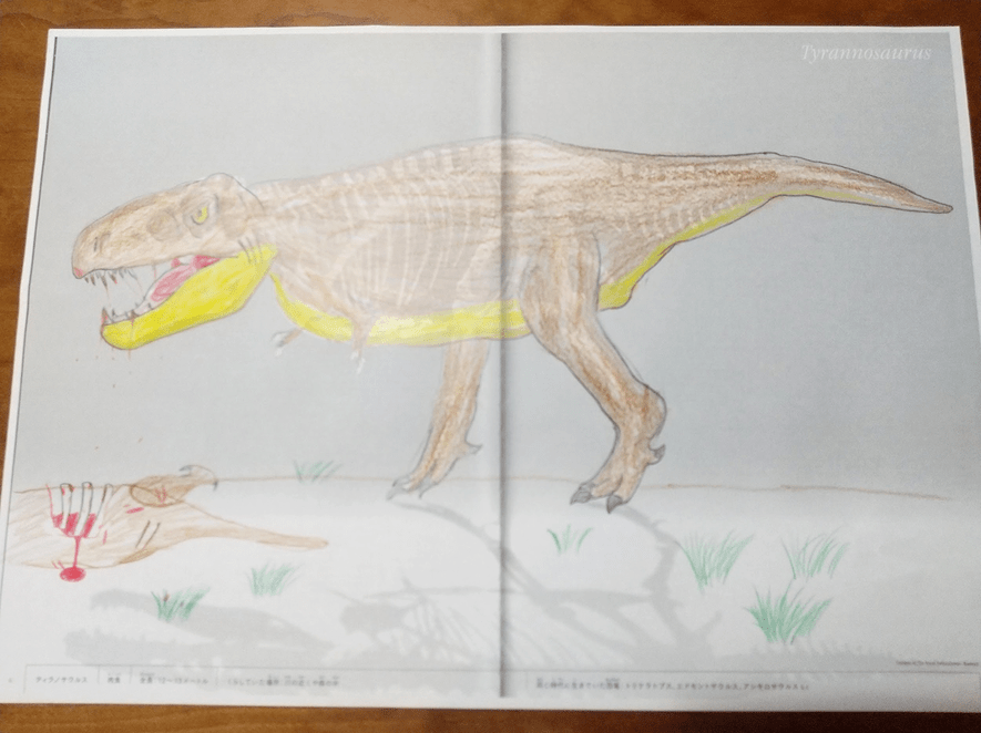 彼女はページ下部に書かれた食性や全長、くらしていた場所などの情報を読み込み、この恐竜がどんな暮らしをしていたのかを想像し、いろんな情報を参考にしながら色をぬっていました。