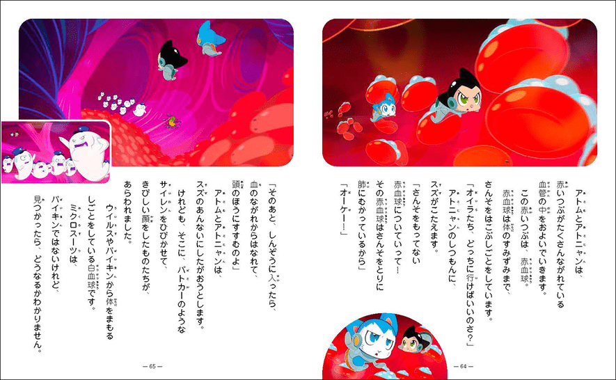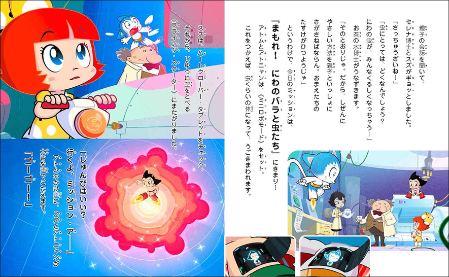 3つ目「ミクロの世界へGO!」は体のしくみがテーマで、赤血球や白血球の働きがわかります。4つ目「アチアチ・アトニャン」では火山が今にも噴火しそうになり、街を救おうとするチームアトムが描かれます。