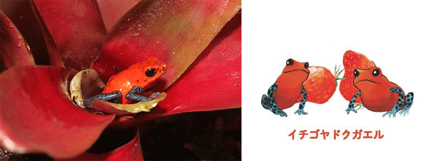 真っ赤な熟れたトマトのような色彩のマダガスカル原産のサビトマトガエル、小さくてイチゴみたいに真っ赤な体色が特徴的な中米原産のイチゴヤドクガエル、どちらもド派手な真っ赤なカエルである。