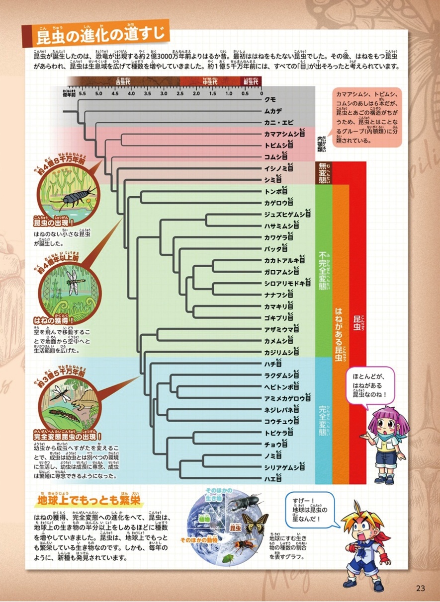 古生代よりもさらに昔をたどると、恐竜が出現する2億3000年前には昆虫が誕生しています。