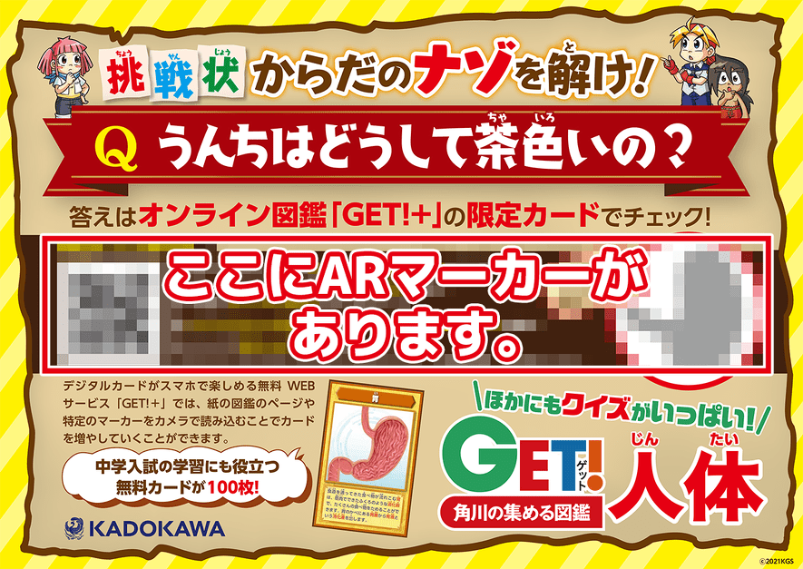 『角川の集める図鑑GET! 人体』の発売を記念して、全国の一部対象書店でGET!+限定カードをゲットすることができるマーカー入りパネルが設置されています。きみはジェイクからの挑戦状のナゾを解き明かせるか!?