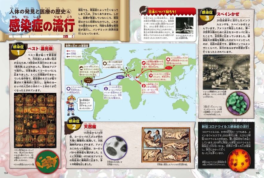 例えば、感染症についてまとめたページでは、世界地図が載せられており、ウイルスが広まった世界的な流れを確認することができるようになっている。そのため、地理や世界史にまで目を向けて学ぶことができる。また、からだをつくる材料として栄養素について説明されているページでは、炭水化物、タンパク質、ビタミンといった、家庭科の授業で学ぶような内容にまで触れられている。