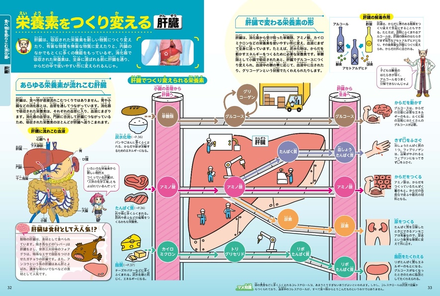 また、本書は視覚的に理解しやすい図やイラストが多く用いられている点もポイントである。例えば先ほどの体をつくる栄養素であれば、それらの栄養素がそれぞれ肝臓で何につくり変えられ体に作用していくかについて、図を通して非常に分かりやすくまとめられている。肝臓でつくり変えられる栄養素というと、私は中高生の時にその名称を丸暗記して覚えたことを思い出す。その時は、いまいちその役割や変化の理由が頭に入ってこず、理解に苦しんだ挙句、丸暗記してしまったのである。しかし、ここまで視覚的に分かりやすく、かつイラストで楽しくまとめてあるものがあれば、過去の私もただの丸暗記ではなく、なぜそうなるのかにまで深い理解をもって学ぶことができたのではないかと感じる。