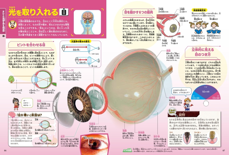 例えば、「目の仕組み」と検索すれば、たくさんの同じような画像が出てきて目の構造を図解してくれる。目の構造だけを知りたい人はこの情報だけで満足するだろう。おそらく子どもも「どうやって目はものが見える仕組みになっているかな」と疑問に思い、検索して出てきた画像だけで満足してしまう(理解しているかどうかは別にして)。しかし、それでは深い学びにつながらない。考えることを終わらせてしまうからである。本書では、目の仕組みについてのページを開けば、目の構造はもちろん、目の周りの筋肉、他の動物の視野に関するトピック、目が悪い原因など様々な情報が書かれている。