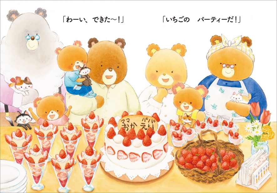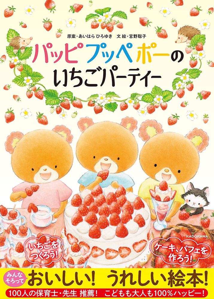 人気絵本シリーズ「くまのがっこう」のあいはらひろゆきさんと、『いちばんしあわせなおくりもの』で第7回リブロ絵本大賞受賞の宮野聡子さんの新作絵本『パッピプッペポーのいちごパーティー』が発売になりました。