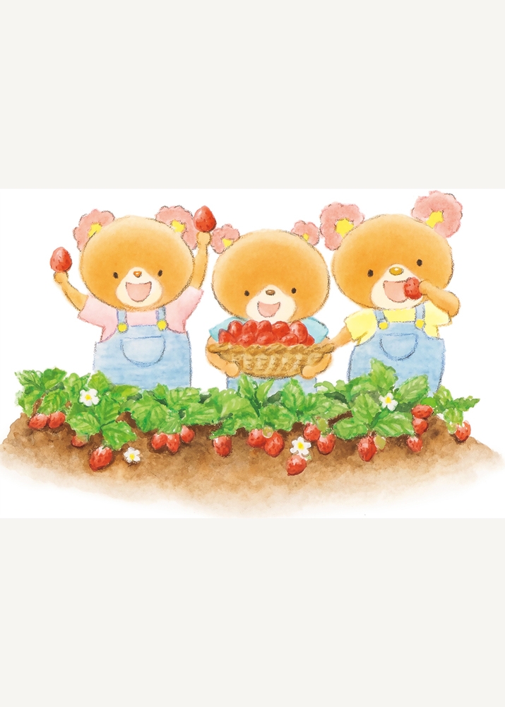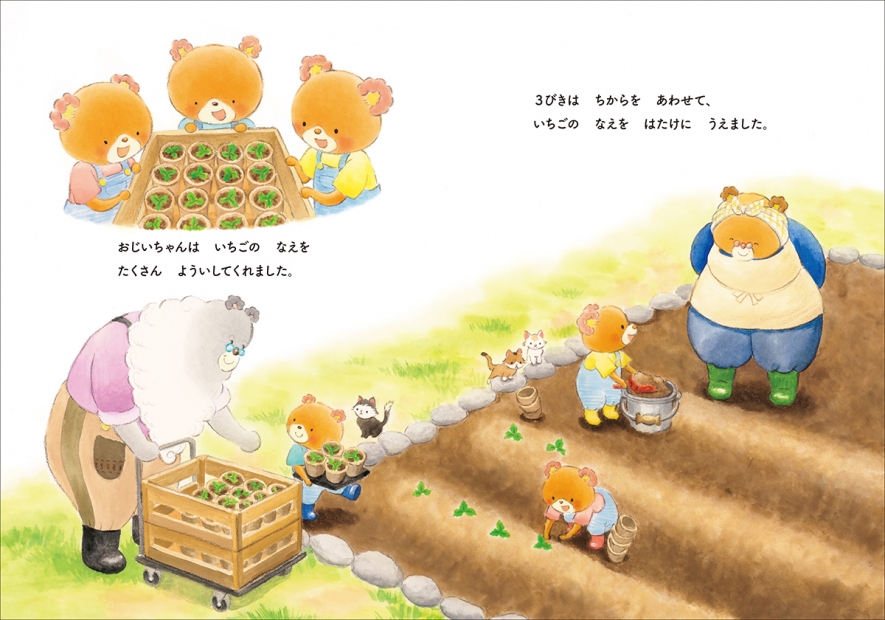 こぐまの3きょうだいのパッピ・プッペ・ポーが、いちごを育てて、いちごのケーキやパフェを作ります。
